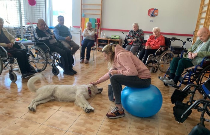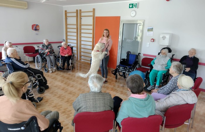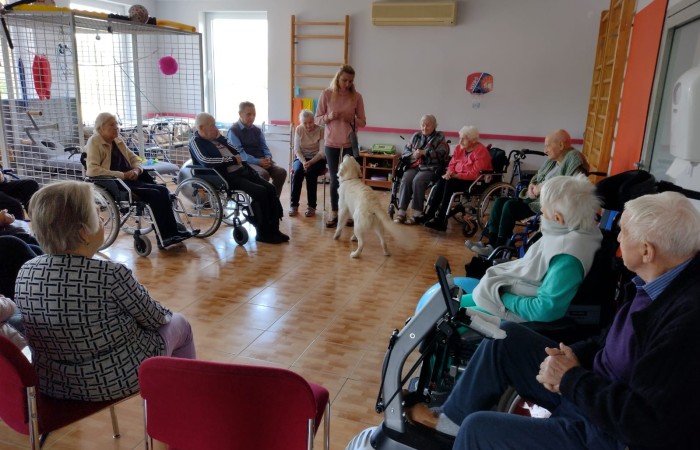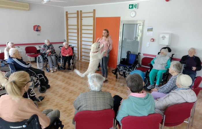 Chętni pensjonariusze mieli okazję indywidualnie pogłaskać, pokarmić i poprosić o wykonanie kilku sztuczek. Po indywidualnych zabawach, w kółku, we wspólnej sali dalej trwała część pokazowa, włączenie do udziału chętnych seniorów, liczne rozmowy i przede wszystkim miła atmosfera!