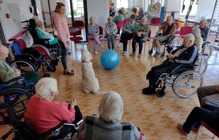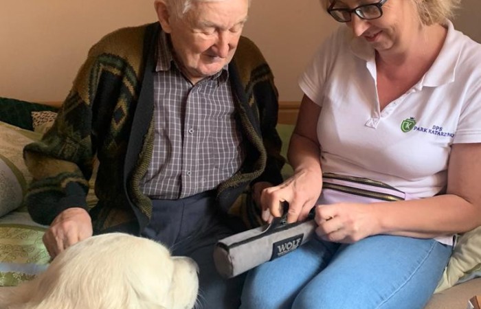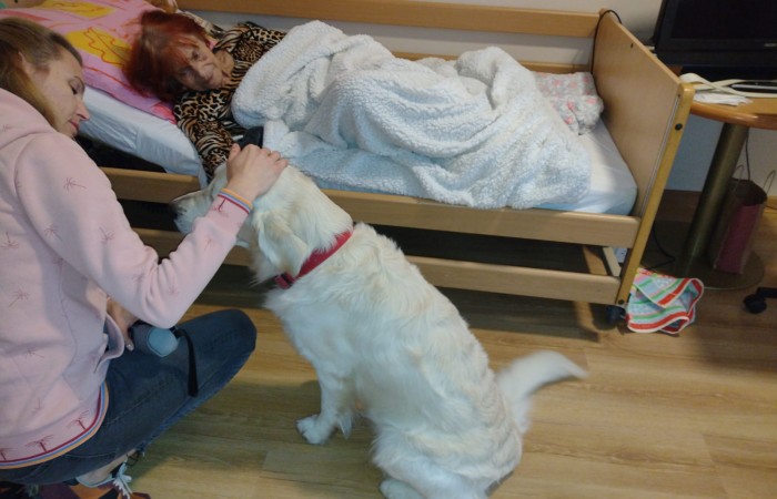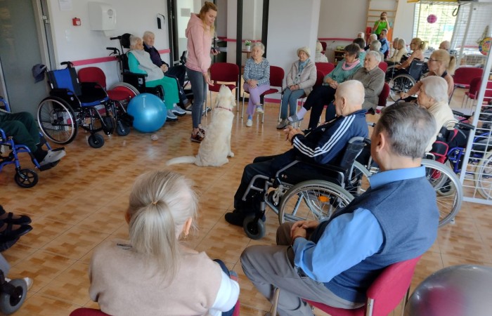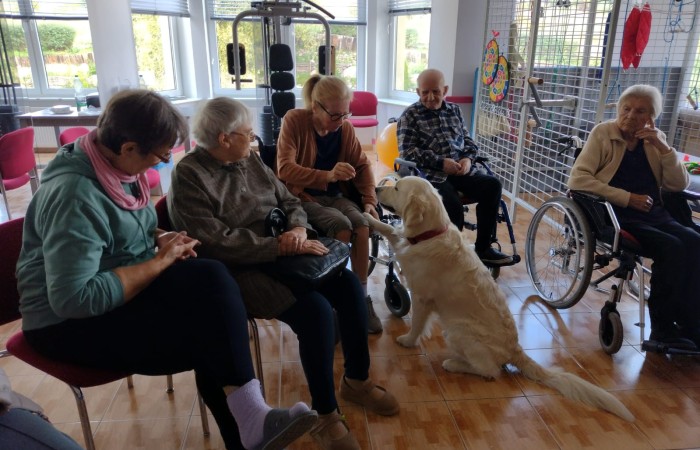 We wrześniu mieliśmy okazję trzykrotnie gościć psa rasy Golden Retriever o imieniu Cosmo wraz ze swoją właścicielką p. Anną Zdunek. Cosmo to rodowodowy, w pełni przebadany i zaszczepiony pies, który chętnie pracuje z osobami starszymi i dziećmi. Dzięki swojej łagodnej i ciepłej naturze, świetnie umilił nam czas w sobotnie przedpołudnie.